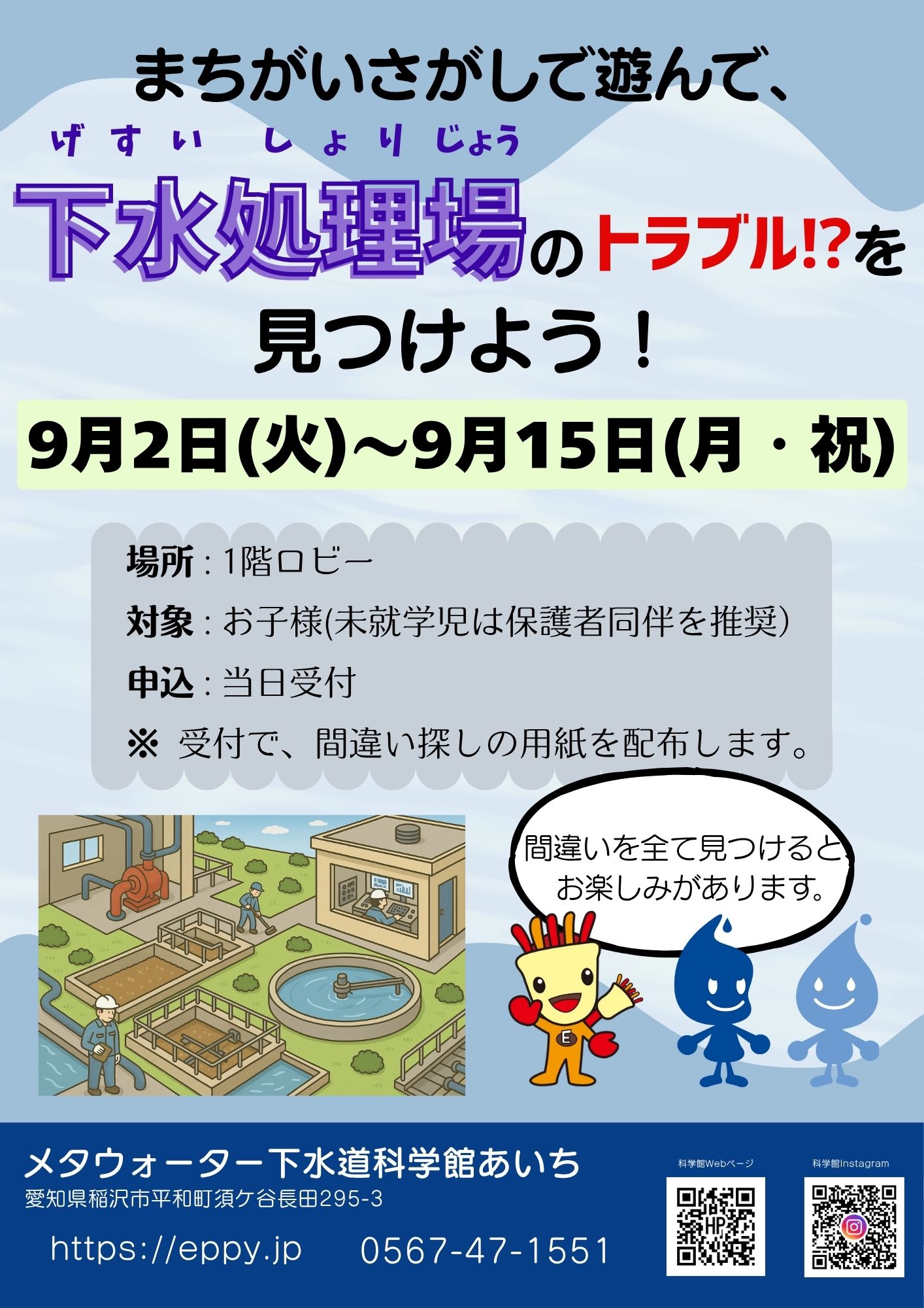 下水道の日 特別企画 ~9月10日は下水道の日!9月は下水道について楽しく学べるイベントが盛りだくさん!~ まちがいさがしで遊んで、下水処理場のトラブルを見つけよう! ◆日時/9月2日(火)~9月15日(月) ◆場所/1階ロビー ◆対象/お子様(未就学児は保護者同伴を推奨) ◆申込/当日受付 ※受付で、間違い探しの用紙を配布します。 間違いを全て見つけると、お楽しみがあります。