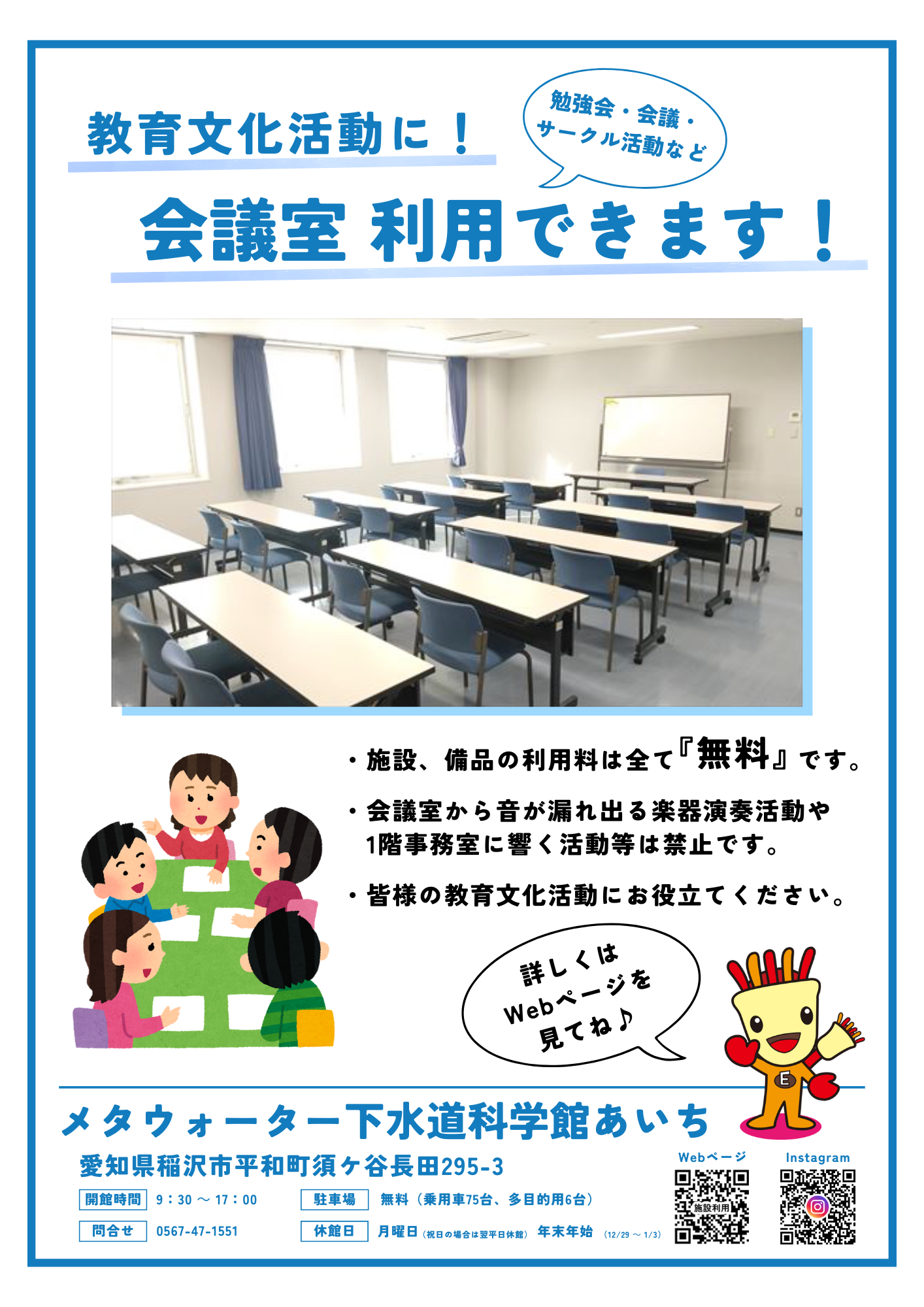 メタウォーター下水道科学館あいち(愛知県下水道科学館)では、『会議室』をご利用いただけます。 施設、備品の利用料は全て無料です。 皆様の教育文化活動等にお役立てください。 注意事項や申請方法など、詳しくはWebページをご確認ください。