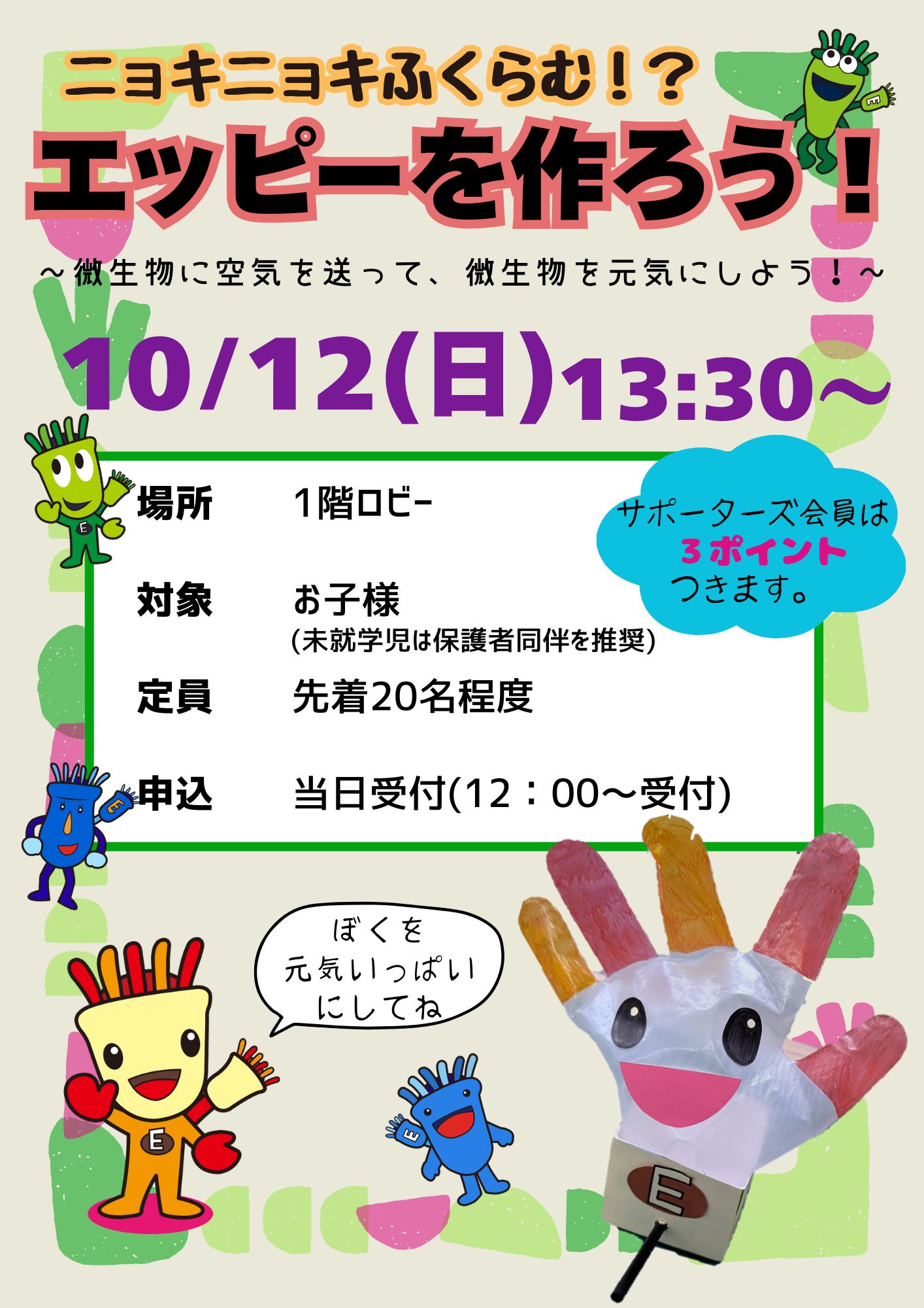 ニョキニョキふくらむ!?エッピーを作ろう! ~微生物に空気を送って、微生物を元気にしよう!~ ◆日時/10/12(日) 13:30~ ◆場所/1階ロビー ◆対象/お子様(未就学児は保護者同伴を推奨) ◆定員/先着20名 ◆申込/当日受付 (12:00~受付) ※団体で工作の参加をご希望の場合は、事前にご連絡ください。 当日の受付は行えません。よろしくお願いいたします。
