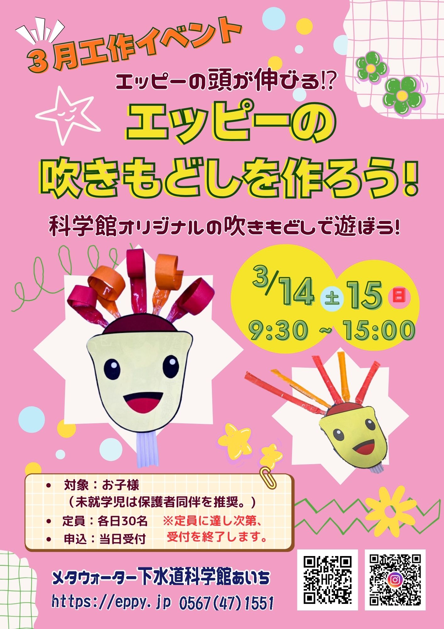 ~エッピーの頭がのびる!?科学館オリジナルの吹きもどしで遊ぼう!~ ◆日時/3月14日(土)・15日(日)9:30~15:00 ◆対象/お子様 ◆定員/各日30名 ◆申込/当日受付 ※定員に達し次第、受付を終了します。
