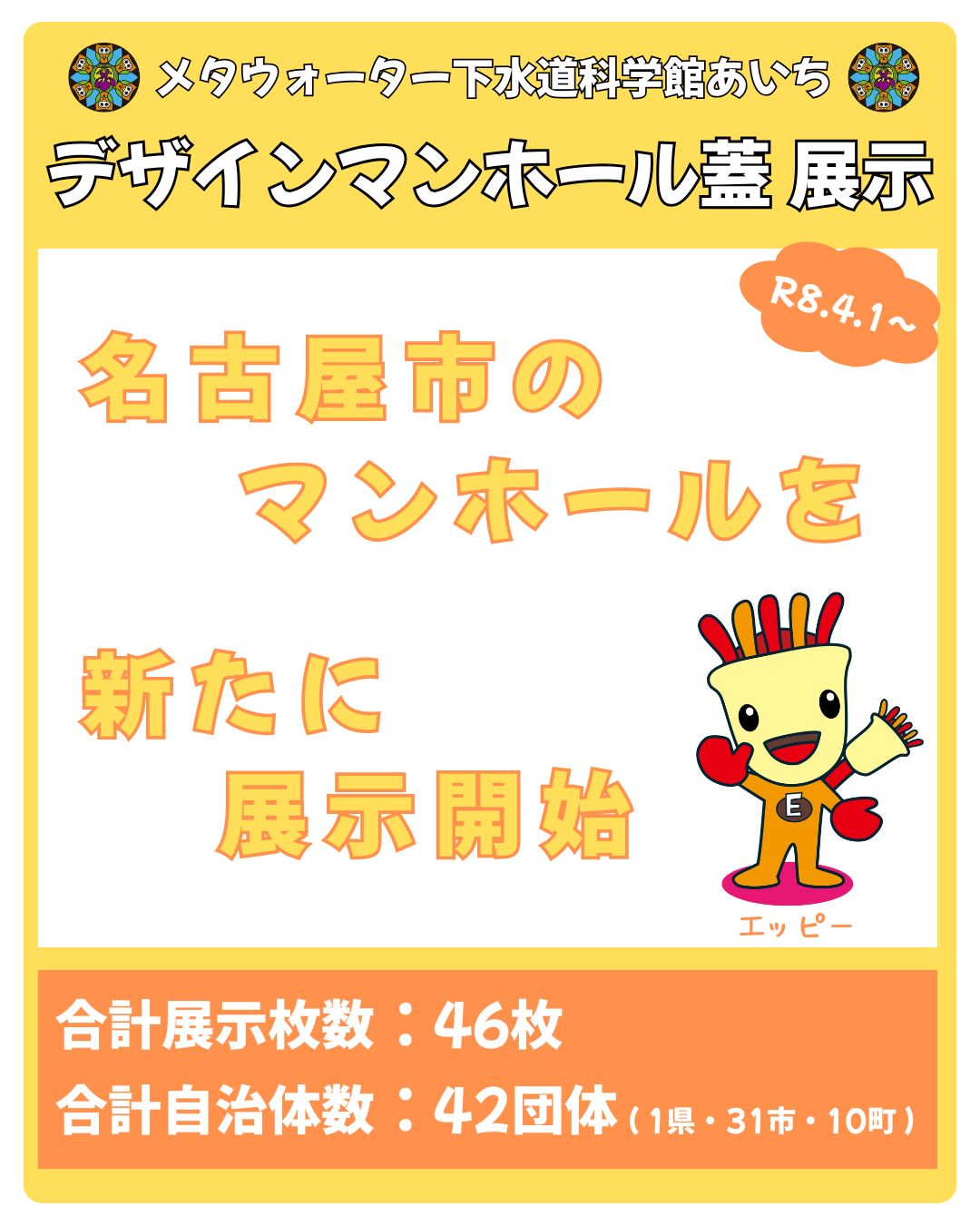 2026年4月1日から、名古屋市のマンホールを新たに展示しました。 実物のデザインマンホールをぜひご覧ください。 [合計展示枚数] ・46枚 [合計自治体数] ・42団体(1県・31市・10町)