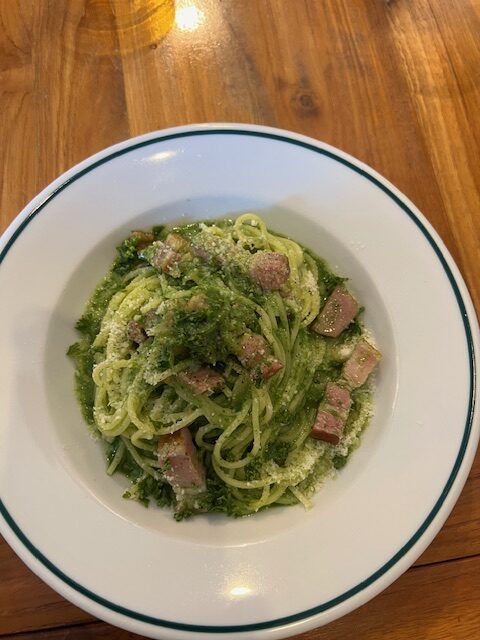 注文したパスタは厚切りベーコンとほうれん草のソースです。